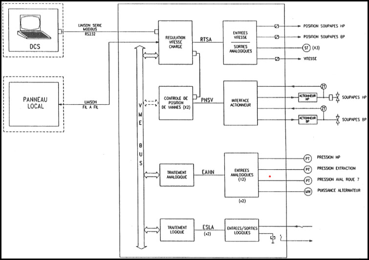 - PNSV: The PNSV module receives steam flow demand from the speed and/or load governors and controls the HP and LP intakes by setting the current in the respective coils of the servo motors. This module integrates a valve lift-flowrate linearization device and a PID controller