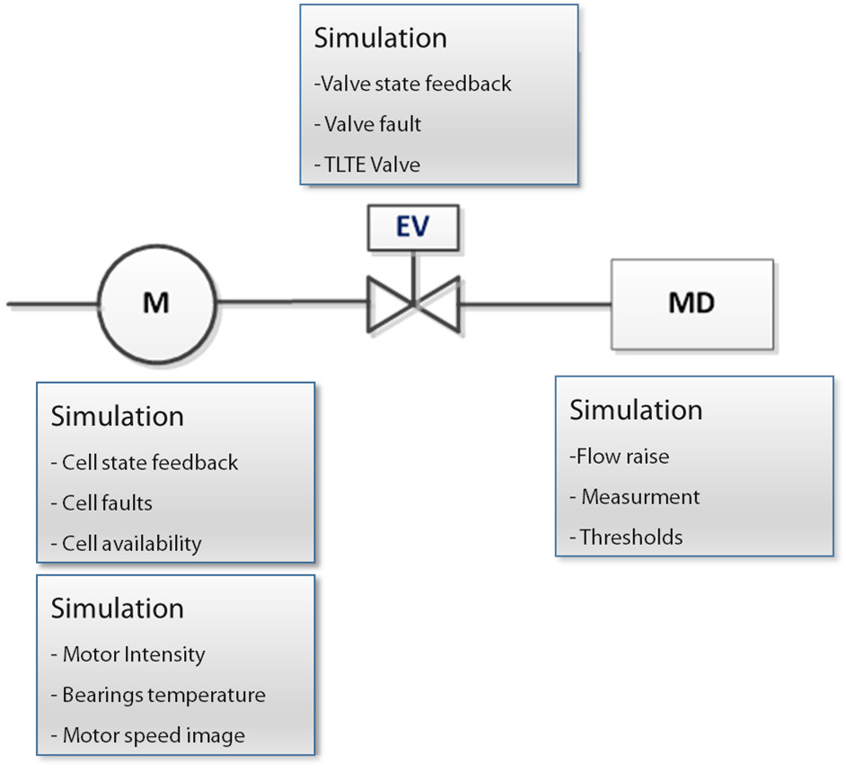 The simulation section interfaces in place of the physical ES to avoid interfering with the internal PLC code under test. Each actuator and measurement block identified in the source code will generate a mirror simulation block allowing to define a (simple) behavior allowing a verification of the transcoding.